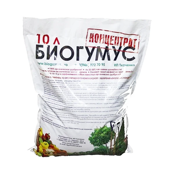 Биогумус качественное органическое комплексное удобрение, продукт переработки органических отходов популяцией дождевого червя. Содержит в сбалансированном сочетании целый комплекс необходимых питательных веществ и микроэлементов, ферменты, почвенные микроорганизмы, гуминовые вещества, витамины. Это также и микробиологическое удобрение, в нем обитает уникальное сообщество микроорганизмов, создающих почвенное плодородие. Биогумус не содержит патогенной микрофлоры, яиц паразитов и вредителей, семян сорняков. Удобрение легко и постепенно усваивается растениями в течение всего цикла своего развития. Биогумус в 10-15 раз эффективнее любых известных органических удобрений и совершенно безвреден на любых почвах. Может использоваться как самостоятельный грунт. Наблюдается повышение урожайности на 30-50%!