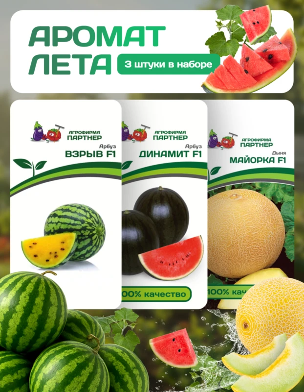 Набор семян "Аромат лета" — это уникальный комплект для тех, кто мечтает о настоящем летнем урожае сладких и ароматных арбузов и дыни прямо у себя на участке.