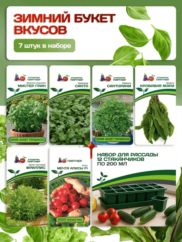 Преобразите ваши зимние месяцы в настоящие гастрономические приключения с набором семян зелени для выращивания на окне! Этот набор создан для тех, кто мечтает о свежих листьях и ароматных травках даже в холодное время года. Главное условие для успешного роста ваших растений — наличие фитолампы, которая обеспечит им необходимый свет и теплоту.