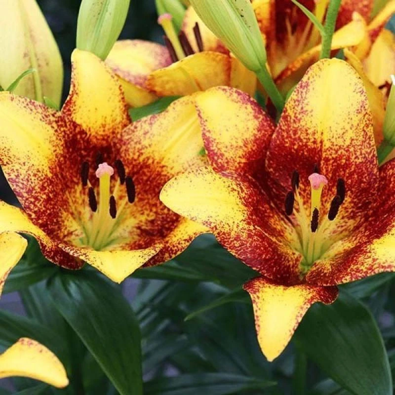 Очень пышный сорт Свит Вэлли, который дает до 20 бутонов на одном стебле через 2-3 года после посадки. Цветение продолжительно – до 4-х недель и приходится на июль-август. В срезанном виде также долго сохраняется, не темнея и не осыпаясь. Цветы роскошные, яркого желто-оранжевого цвета, со светло-коричневым крапом, их диаметр составляет в среднем 20 см.