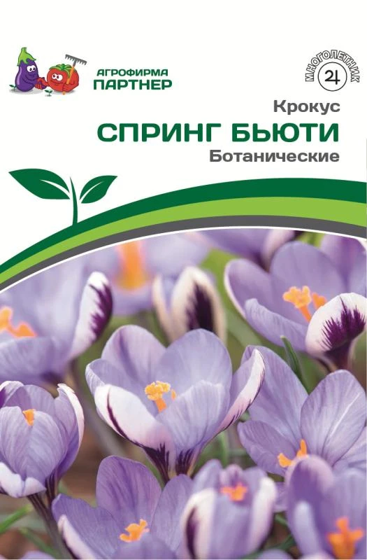 Спринг Бьюти очень небольшие, высотой всего 8-10 см. Бокалы цветков слоновой кости имеют причудливые фиолетовые разводы в виде перьев у основания. Внутренняя часть лепестков розовато-сиреневая. Листья этого крокуса тоже очень необычные: центральная жилка окрашена в светло-зелёный цвет.