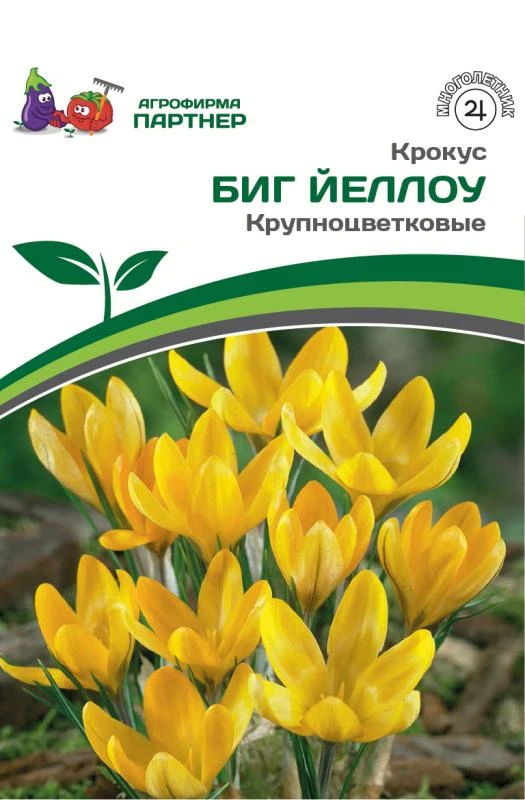 Крокус Биг Йеллоу высотой 10-15 см, большая часть которых приходится на сам цветок ярко-желтой окраски.