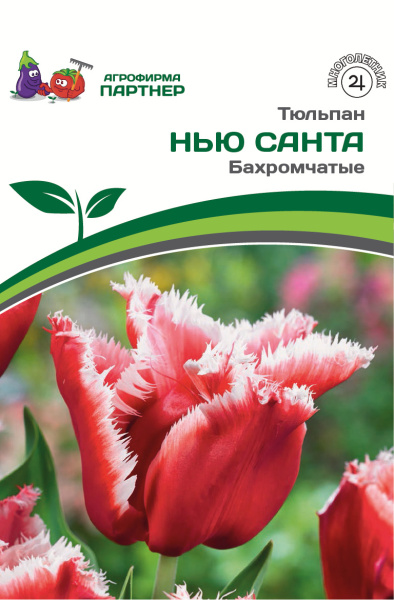 Сорт Нью Санта своим яркими и роскошными оттенками напоминает дорогое платье королевы. Благодаря двуцветной окраске, крупный бокаловидный цветок смотрится очень эффектно. Лепестки насыщенного красного цвета контрастируют с белоснежной длинной бахромой. Высота бокала достигает 7-8 см, а его диаметр 8-10 см. Высота растения 40 см.