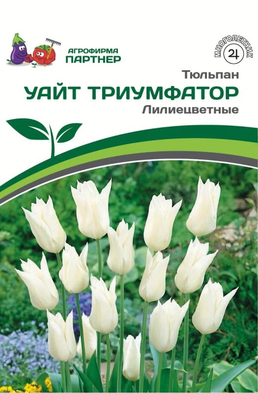 Сорт Уайт Триумфатор – один из самых элегантных тюльпанов в данной группе! Растение высокорослое, до 60 см высотой, имеет крепкий цветонос, благодаря которому долго будет радовать вас своим цветением. Бокал цветка очень изящный, с заостренными лепестками, высотой 8-9 см и диаметром до 7 см.