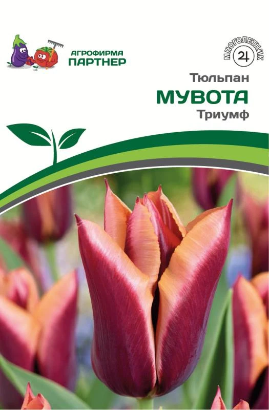 Сорт Мувота относится к тюльпанам премиального класса. Растения крепкие, высотой 45-50 см, великолепны в срезке. Цветки имеют слегка заостренные лепестки и благодаря сочетаниям цветов будто светятся изнутри. Бокалы достигают 9-11 см в высоту и в раскрытом состоянии имеют 8-10 см в диаметре.
