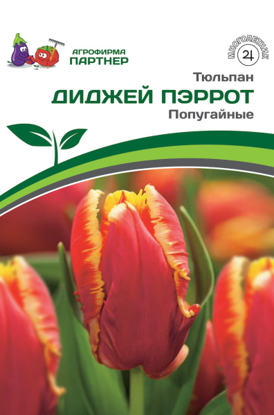 Диджей Пэррот – достаточно новый сорт попугайных тюльпанов. Его двухцветные лепестки красно-желтого цвета с глубоко изрезанными краями напоминают перья экзотичной птицы. При полном роспуске диаметр цветка может достигать 20 см! Бутоны раскрываются днем, закрываясь на ночь. Цветение долгое – до 1 месяца, а в срезке цветы могут стоять около 2-х недель, не теряя декоративности.