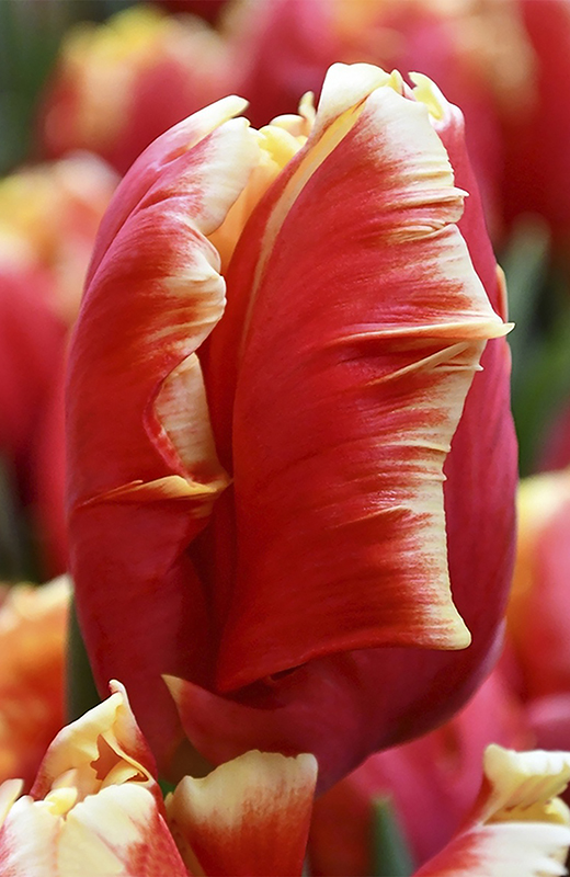 Диджей Пэррот – достаточно новый сорт попугайных тюльпанов. Его двухцветные лепестки красно-желтого цвета с глубоко изрезанными краями напоминают перья экзотичной птицы. При полном роспуске диаметр цветка может достигать 20 см! Бутоны раскрываются днем, закрываясь на ночь. Цветение долгое – до 1 месяца, а в срезке цветы могут стоять около 2-х недель, не теряя декоративности.