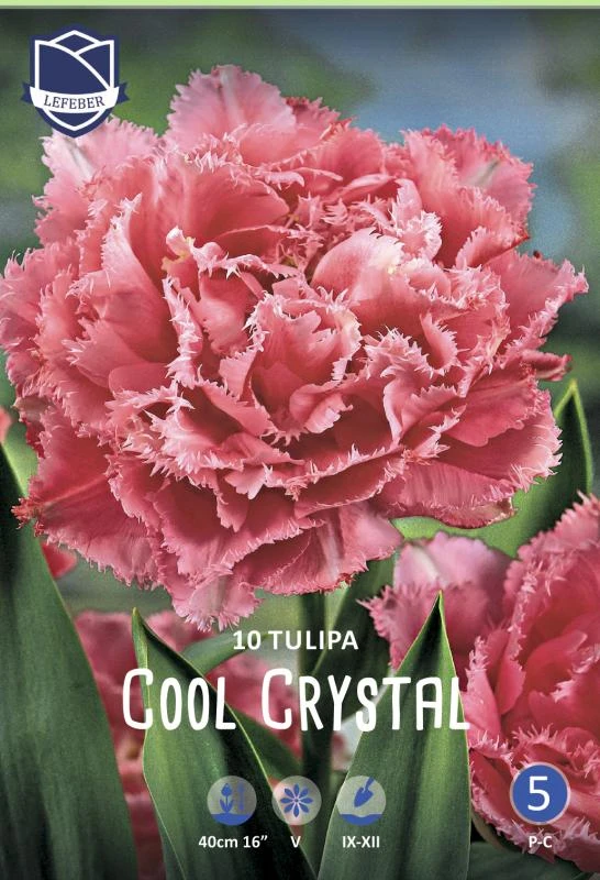 Сорт Кул Кристал относится к группе тюльпанов "Двойной эффект". Его роскошные махрово-бахромчатые цветки достигают 8-9 см в высоту и 9-10 см в диаметре. Невероятно крепкий цветонос высотой около 50 см и плотные лепестки способны выстоять при любой непогоде. Окраска лепестков ярко-розовая и кремовая, а густая игольчатая бахрома - белоснежная.