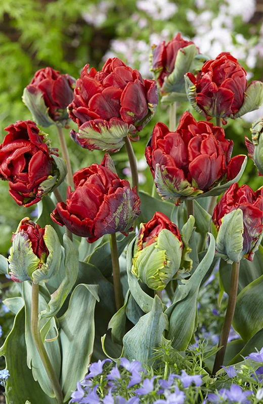 Тюльпан Рококо Дабл Tulipa Rococo Double относится к группе супер-тюльпанов "Двойной Эффект". Этот тюльпан сочетает в себе сразу несколько признаков: попугайный и махровый. Высота растения достигает 45 см. Окраска цветка: ярко-красная с тёмным напылением по центру лепестков, глянцевый, нижние лепестки зелёные с красной каймой. Высота бокала 8-10 см. Период цветения - апрель-май. Почва - нейтральная или известково-кислая. Сорт идеален для выращивания в открытом грунте. Сфера использования - ландшафтный дизайн, домашние декорации.