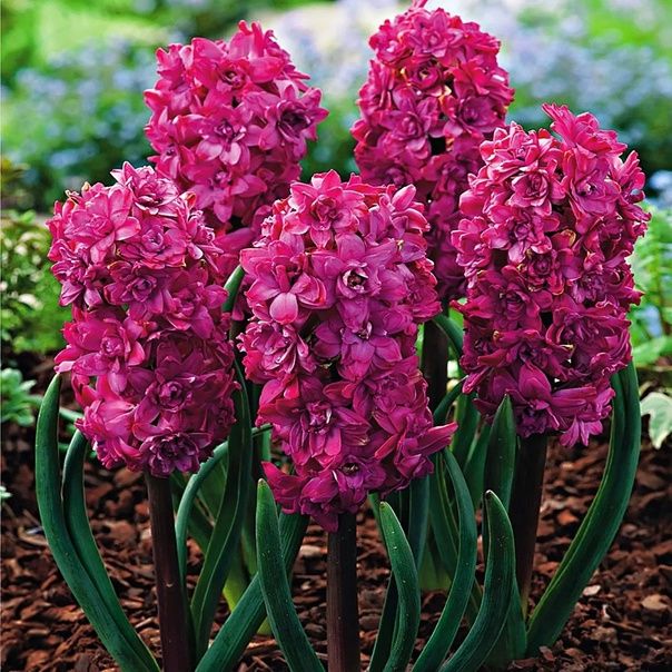 Гиацинт "Red Diamond" - это махровый сорт, который выделяется яркими, насыщенно-красными цветками, собранными в плотные, шаровидно-цилиндрические соцветия. Цветки махровые, каждый с большим количеством лепестков, что придает им объемный вид. Соцветия достигают высоты до 20 см, а высота самого растения в среднем 25-30 см. "Red Diamond" славится своим сильным и приятным ароматом. Этот сорт подходит для выращивания в открытом грунте, в контейнерах, а также для выгонки в домашних условиях.