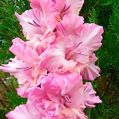 Гладиолус Самара имеет гофрированный нежно-розовый цветок с малиновыми штрихами на лепестках. Крупные пышные цветки собраны в плотные соцветия, расположенные на растениях высотой 100-110 см. Гладиолусы предпочитают солнечные или слегка притененные участки без застоя влаги в почве и защищенные от ветров. Рекомендуемое время посадки: апрель-май, когда температура почвы достигнет +8+12 градусов на глубину 10-12 см (в зависимости от размера луковиц) с расстоянием 10-15 см друг от друга.