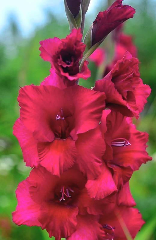 Высота растения - 90-120 см. Цветы слегка гофрированные, крупные, диаметром 12-15 см. Темно-бордовые бутоны раскрываются в яркий малиновый цветок с небольшими белыми мазками в сердцевине. Период цветения: с июля-август. Гладиолусы предпочитают солнечные или слегка притененные участки без застоя влаги в почве и защищенные от ветров. Рекомендуемое время посадки: апрель-май, когда температура почвы достигнет +8+12 градусов на глубину 10-12 см (в зависимости от размера луковиц) с расстоянием 10-15 см друг от друга.