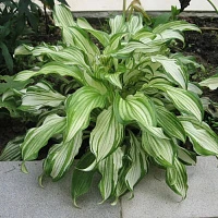 Хоста Киви Сперминт – это привлекательный низкорослый сорт, высота которой достигает 30 см. Листья этой маленькой, но очень красивой хосты заметно закручиваются, на их зеленовато-белом фоне отчетливо видны яркие зеленые полоски, как будто их нарисовал шутник-художник. При этом ближе к концу лета, когда период цветения на исходе, зеленый цвет в листьях занимает больше места. Хоста Киви Сперминт украсит дорожки и бордюры дачного участка, поможет Вам при составлении оригинальных цветочных композиций в контейнере.