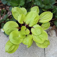 Хоста Лемон Снэп имеет привлекательную расцветку декоративной листвы. Сочные, блестящие листья гармонично сочетаются с темно-бордовыми массивными черешками. Крупные остроконечно-овальные желто-зеленые листья украшены светло-бордовыми жилками, отчего лист приобретает невероятно красивую гофрированность. Растение компактное, высотой до 30 см. Желтоватые с блеском кусты сорта создадут прелестный фон переднего плана для всей цветочной композиции клумбы.