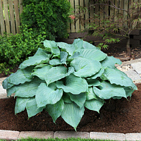 Сорт хосты с большими блестящими, сине-зелеными листьями. Растения высотой 50 см в ширину могут разрастаться до 1 м. Крупные округлые листья плотной фактуры имеют чашевидную форму с красивой волной по краю. Ароматные цветки окрашены в белый с лавандовой дымкой цвет и располагаются на высоких цветоносах.