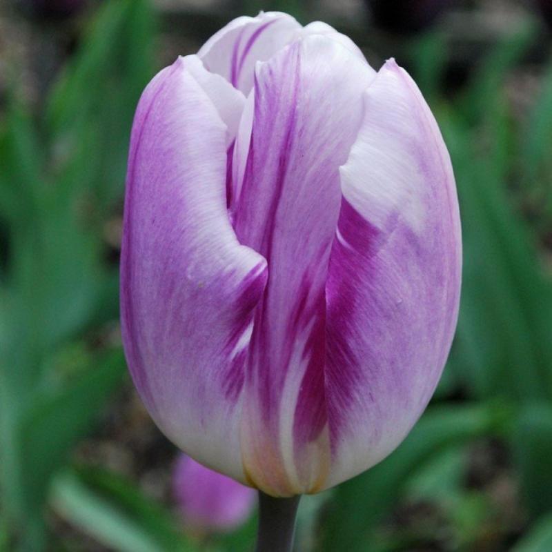 Тюльпан Флиг Флаг Относится к группе Триумф, высота растения до 40 см, цветок бокаловидный, крупный. Окраска цветка нежно-фиолетовый с розовым отсветом, светлой каймой и ярко-фиолетовыми мазками, высота бокала цветка до 10 см. Посадка - август, сентябрь, октябрь. Глубина посадки зависит от размера луковицы и составляет в среднем 8-12 см. Минимальное расстояние между луковицами должно вдвое превышать их диаметр. Период цветения - апрель - май. Почва - нейтральная или известково - кислая. Тюльпан Флиг Флаг универсален, используется для выгонки, для украшения парков и садов. Цветет довольно продолжительное время и хорошо сохраняет форму бокала. Недостатком является слабая сопротивляемость вирусу пестролепестности.