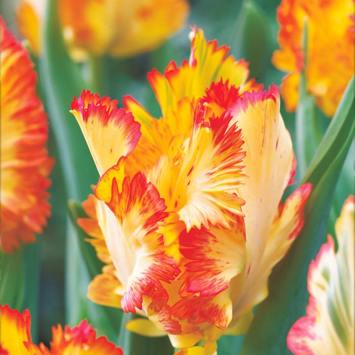 Яркий, солнечный, пышный - самый настоящий попугайный тюльпан, дарящий море позитива! Сорт невероятно праздничный и является предвестником жаркого лета! Его окраска жёлтая, с редкими бликами розового. Края лепестков красные, при этом кайма сильно рассечена. Поэтому кажется, будто тюльпан расхохорился, как настоящая птица. Несмотря на небольшую высоту, тюльпан имеет довольно крупный бутон, который в полном раскрытии может достигать 15 см! Невероятный сорт, который украсит любой сад!
