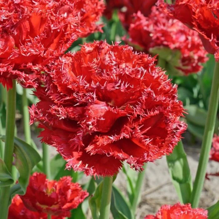 Очень яркий, экзотический сорт тюльпана, который относится к серии "Двойной эффект". Плотные лепески насыщенного красного цвета в большом количестве образуют махровый цветок. по краю лепестки украшены игольчатой бахрамой более светлого, практически белого цвета. Если посадить этот тюльпан в полутени, то он не раскроет бутон до конца, а вот на солнце огромные цветы открыты полностью и похожи на фантастические пионы!