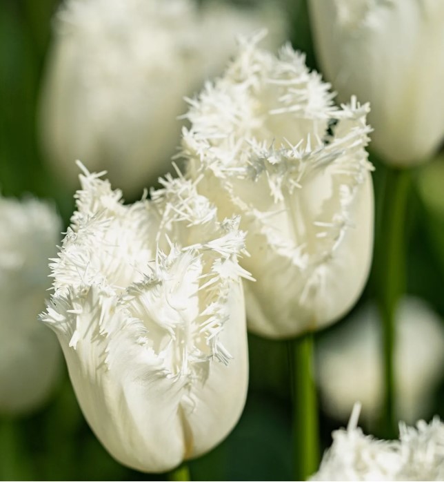 Тюльпан бахромчатый Кембридж восхищает белизной расцветки. А пышная бахрома по краям лепестков кажется натуральным инеем, запорошившим цветки. Изумрудная зелень подчеркивает белоснежный наряд.