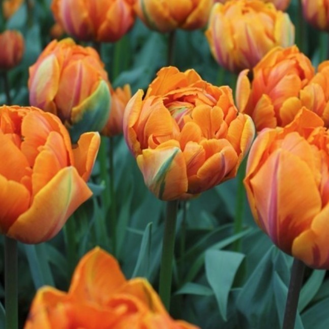 Фруктовые оттенки этого сорта придадут вашему саду тепла и праздничного настроения. Сорт относится к группе махровых поздних и отличается продолжительным цветением. Окраска густомахровых цветков очень яркая: абрикосово-оранжевая с розовыми и красными мазками. Кроющие лепестки украшены зелеными полосами, что делает цветок еще более декоративным.
