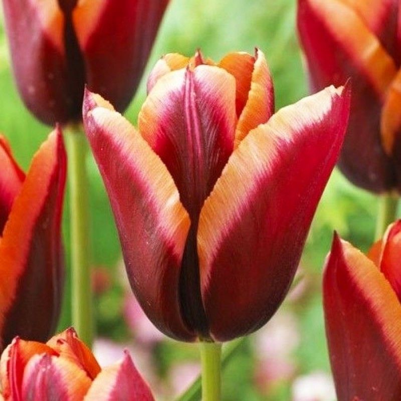 Сорт тюльпана с очень необычной окраской. Относится к группе Триумф. Атласные плотные лепестки окрашены в богатый винно-бордовый цвет, по краю идет широкая лососево-оранжевая полоса. Растения смотрятся очень дорого и эффектно. Они шикарно будут сочетаться с другими тюльпанами оранжевых оттенков, превосходны в срезке, а также подходят для выгонки в зимний период.