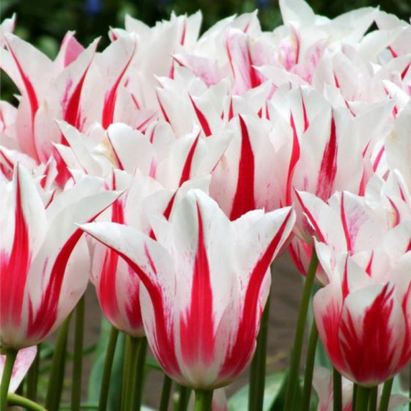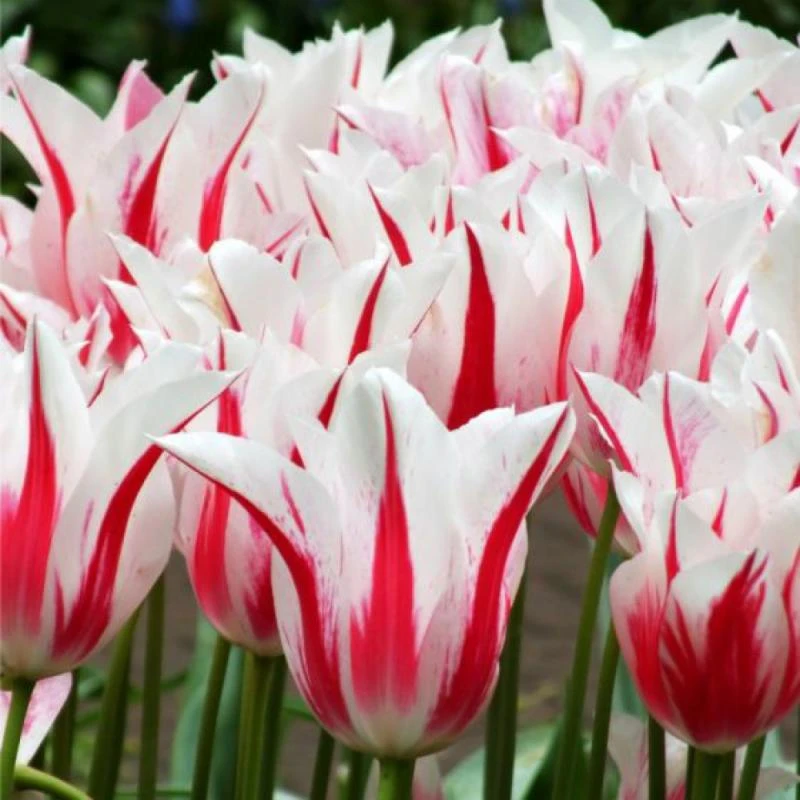 Сорт Мэрилин отличается изысканностью и утонченностью. Растение высотой 45-50 см. Высота бокала 8-9 см и диаметр 8-10 см. Изящный и соблазнительный тюльпан, с высоким и стройным цветоносом, заканчивающимся деликатным бутоном. Белоснежные лепестки снаружи и изнутри украшены небрежными розово-красными мазками, напоминающими полустёртую помаду. Лёгкая гофрированность краешков лепестков точно имитирует причёску Мэрилин Монро