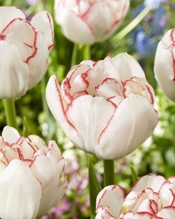 Тюльпан "Wild Romance" отличается необычным сочетанием белого цвета с красным краем, что делает его весьма привлекательным и уникальным. Цветковый стебель имеет вторичные красные оттенки, которые дополняют общую композицию цветка.