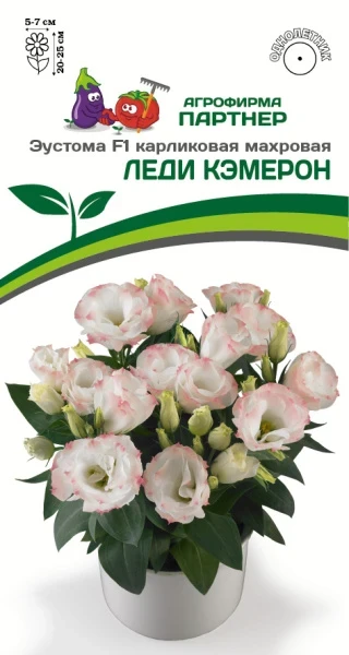 Лучшая контейнерная новинка для дома и сада! Чрезвычайно декоративную ЛЕДИ КЭМЕРОН отличает компактность, прочность стеблей и исключительная выравненность растений. Отличное кущение позволяет закладывать большое количество бутонов, образуя невероятную шапку из цветков. Это миниатюрное растение формирует цветоносы практически из розетки листьев. Несоизмеримо крупные, густомахровые, ширококолокольчатые цветки до 7 см в диаметре расположены по несколько штук на верхушках стеблей и в пазухах листьев. Эустома отлично проявляет себя в садовых композициях: рокариях, альпинариях и цветниках. Представьте, как украсит Леди Кэмерон прохладный подоконник, сохраняя декоративность более 5 месяцев. Серия надежная, выносливая и устойчивая к капризам погоды и болезням, в том числе и к серой гнили (Botrytis). Чтобы уже в начале лета наслаждаться цветением, стоит своевременно позаботиться о выращивании рассады. Рекомендуемый объем кашпо – 3-5 л на одно растение или схема посадки в грунт – 20х20 см.