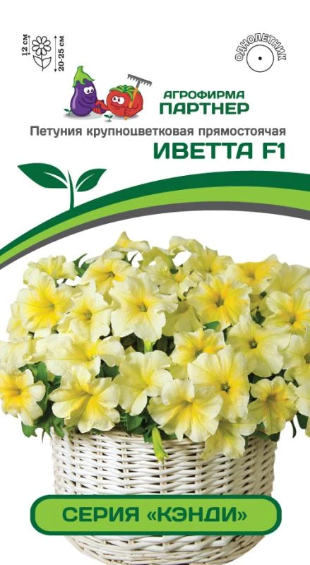 «КЭНДИ» – невероятно заманчивая серия петунии нового поколения с ранним сроком цветения и отличной выравненностью! Нельзя не восхищаться ее крупными, велюровыми цветками с легкой волной края. Цветет без устали с мая по октябрь, благодаря наличию мужской стерильности. Имея усиленное и многочисленное ветвление, цветки равномерно распределяются по всему кусту, образуя роскошный цветочный шар. Отличается чрезвычайной выносливостью и способностью адаптироваться к широкому диапазону температур от -5°С до +40°С. При минусовых температурах растение не гибнет, а лишь замедляет свой рост. Ширина куста 50 см, высота растения 20 см, диаметр цветка 12 см. Чтобы петуния полностью раскрыла свой потенциал, рекомендуем объем кашпо 7-10 л на одно растение и схему посадки в грунте – 35х35 см.