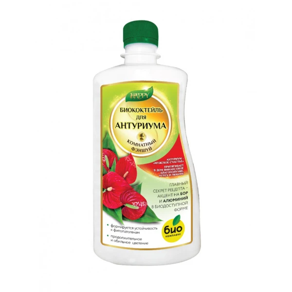 Биококтейль для АНТУРИУМА содержит полный набор легко усваиваемых растением витаминов и микроэлементов в биодоступной форме, с учётом повышенной потребности растения в БОРЕ (В) и АЛЮМИНИИ (Al).