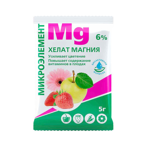 Микроудобрение для профилактики и коррекции дефицита магния у садово- огородных и декоративных культур. Подкормка растений магнием придает листьям насыщенный зеленый цвет, повышает урожайность, улучшает вкус овощей, ягод и фруктов.