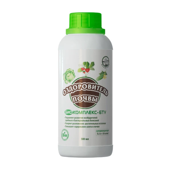 Оздоровитель Почвы Биокомплекс-БТУ, 500 мл - это микробиологическое удобрение для оздоровления почвы, ускоренного разложения растительных остатков и повышения содержания азота в почве.