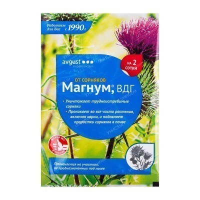 Avgust Магнум – гербицид для защиты от однолетних и некоторых многолетних двудольных сорняков на участках и территориях не предназначенных под посев, а также отмостках, вокруг построек и так далее. Препарат проникает во все части растения, включая корни, и подавляет проростки сорняков в почве. Гибель сорняков происходит через 10-15 дней или позднее в зависимости от погодных условий. Период защитного действия не менее 6 месяцев.