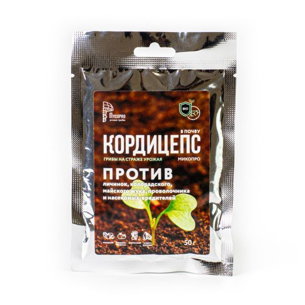 БиоИнсектицид "Кордицепс-Микопро" - неспецифический энтомопатоген, используемый для биологического контроля насекомых-вредителей. Споры гриба в почве при попадании на тело вредителя в течение 10-12 часов прорастают и поражают жировую ткань, кишечный тракт, парализуют нервную систему, мышечную ткань и органы дыхания. В результате вредитель гибнет и становится источником развития для самого гриба и другой микрофлоры почвы. Полная гибель наступает через 40-120 часов в зависимости от возраста личинки или имаго. Мертвый вредитель мумифицируется, покрывается беловато-лиловой споруляцией. Безопасен для людей, животных, дождевых червей. Применяется для следующих культур: плодово-ягодные (яблоня, груша, вишня, слива, виноград, черная смородина, крыжовник и клубника); овощи открытого и закрытого грунта; зерновые культуры (пшеница, рожь, ячмень, кукуруза); технические (сахарная свекла, рапс, подсолнечник, соя); декоративные деревья и кусты; рассада цветочных культур; комнатные цветочные культуры.