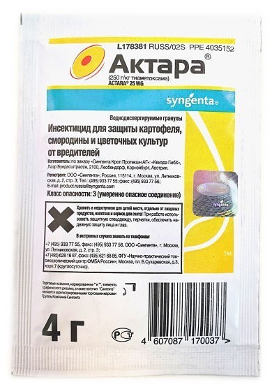 Актара – инсектицид группы неоникотиноидов. Имеет сильный эффект против большого количества вредителей. Эффективен и при внесении в почву, и при опрыскивании поверх земли. Применяют против колорадского жука на картошке, против тли на смородине и от трипсов, ложнощитовок, щитовок и белокрылки на овощных и цветочных культурах. В течение получаса после обработки вредители перестают питаться, а в течение суток наступает гибель вредителей. При внесении Актары под корень, защитное действие держится до 2-х месяцев, а при опрыскивании – до 4-х недель. При соблюдении рекомендаций производителя, возможности возникновения резистентности у вредителей отсутствует. Нормы расхода в зависимости от культуры и вредителя смотрите на упаковке. Класс опасности - 3 (умеренный).