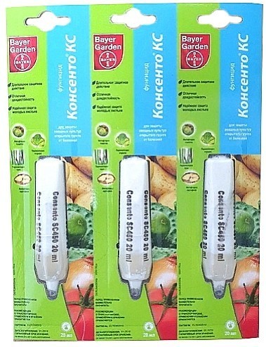 "Консенто" -  это НОВЫЙ фунгицидный препарат системно-трансламинарного действия от компании «Байер» с защитным и лечебным эффектом для борьбы с фитофторозом и альтернариозом на картофеле и томатах открытого грунта и пероноспорозом на луке (на репку) и огурцах открытого грунта.